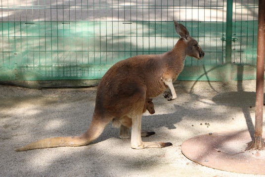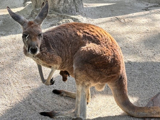 袋からチラッと顔をのぞかせるカンガルーの赤ちゃん
