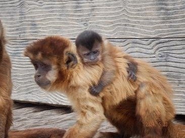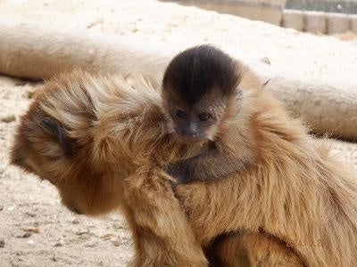 お母さんにしがみついて離さないフサオマキザルの赤ちゃん