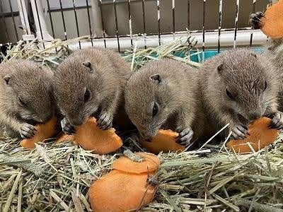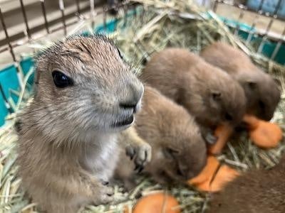 仲良くニンジンをかじるプレーリードッグの赤ちゃんたち