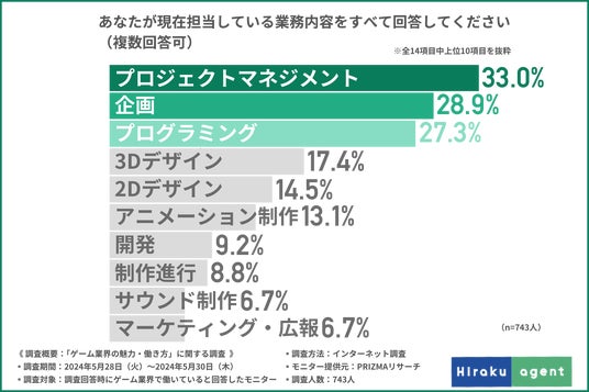 「あなたが現在担当している業務をすべて回答してください(複数回答可)」と質問したところ、『プロジェクトマネージメント(33.0%)』と回答した方が最も多く、次いで『企画(28.9%)』『プログラミング(27.3%)』と続きました。