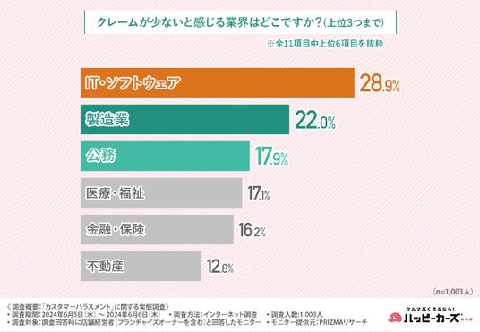 ここまでの調査で、理不尽なクレームの割合や実際に受けたクレームの内容が明らかになりました。また、比較的クレームが少ないとされる業界もあるようです。