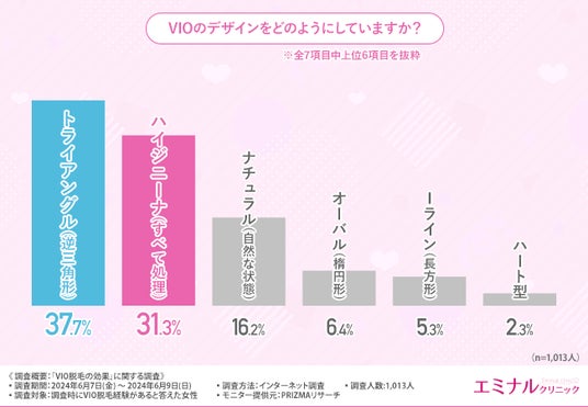 次に、「VIOのデザインをどのようにしていますか?」と質問したところ、『トライアングル(逆三角形)(37.7%)』と回答した方が最も多く、次いで『ハイジニーナ(すべて処理)(31.3%)』と続きました。