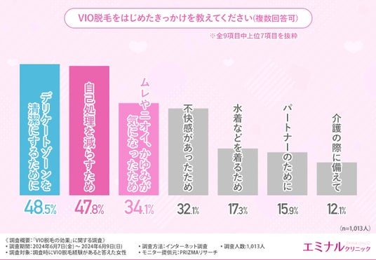 はじめに、「VIO脱毛をはじめたきっかけを教えてください(複数回答可)」と質問したところ、『デリケートゾーンを清潔にするために(48.5%)』と回答した方が最も多く、次いで『自己処理を減らすため(47.8%)』『ムレやニオイ、かゆみが気になったため(34.1%)』と続きました。