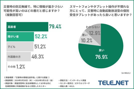 「スマートフォンやタブレット操作が不慣れな方にとって、災害時に自動起動放送型の個別受信タブレットがあったら良いと思いますか?」と質問したところ、約8割の方が『良い(76.9%)』と回答しました。