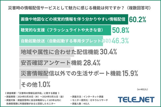 続いて、「災害時の情報配信サービスとして魅力に感じる機能は何ですか?(複数回答可)」と質問したところ、『画像や地図などの視覚的情報を伴う分かりやすい情報配信(60.2%)』と回答した方が最も多く、次いで『聴覚的な支援(フラッシュライトや大きな音)(50.8%)』『自動起動放送(自動起動する専用タブレットあり)(46.3%)』と続きました。