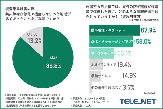 はじめに、「能登半島地震の際、防災無線が停電で機能しなかった地域が多くあったことをご存知ですか?」と質問したところ、約9割の方が『はい(86.8%)』と回答しました。