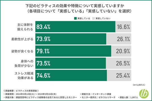 「下記のピラティスの効果や特徴について実感していますか(「実感している」または「実感していない」を選択)」と質問したところ各項目について「実感している」と回答した方の割合は『主に体幹を鍛えられる(83.4%)』『柔軟性が上がる(73.9%)』『姿勢が良くなる(79.1%)』『身体への負荷が少ない(73.5%)』『ストレス軽減効果がある(74.6%)』という結果になりました。