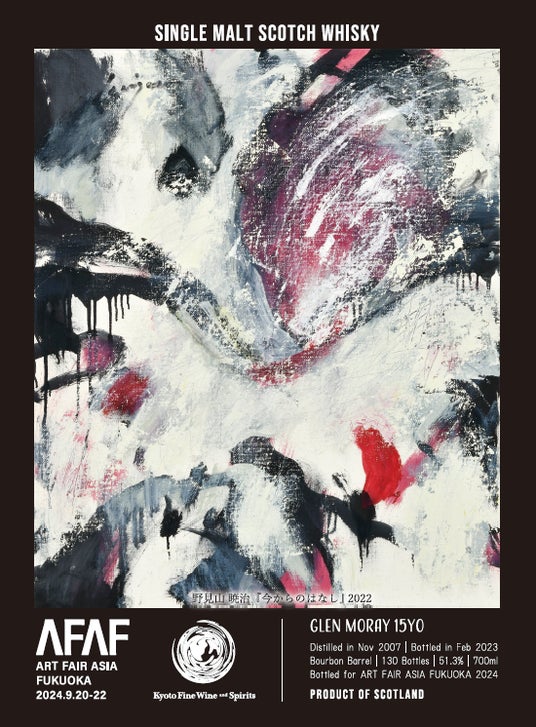 九州最大のウイスキーの祭典「ウイスキートーク福岡」と連携し、アート×シングルモルトウイスキーのコラボレーションとして「AFAF Private Bottle Series」をスタート。日本とアジアを結ぶ交流都市"福岡"で開催されるアートフェアとして、「福岡・九州」や「アジア」と関わるアーティストの作品をラベルにあしらったプライベートボトルを展開いたします。記念すべき第1回の今年は、戦後の日本美術史に大きな足跡を遺した福岡の巨匠・野見山暁治(1920-2023)と、120年以上の歴史を持つスコッチウイスキーであるグレンマレイがコラボレーション。スコットランドのスペイサイド地方にあるグレンマレイ蒸溜所のモルトを樽買い(シングルカスク)し、101歳の野見山暁治が描いた「今からのはなし」(2022)をラベルとしました。プライベートボトルは130本の限定で、8月下旬よりAFAF公式サイトの特別ページより予約販売を開始。AFAF会場でも、エントランスに展開予定の「Bar Higuchi×AFAF」コーナーにて数量限定で提供を予定しています。