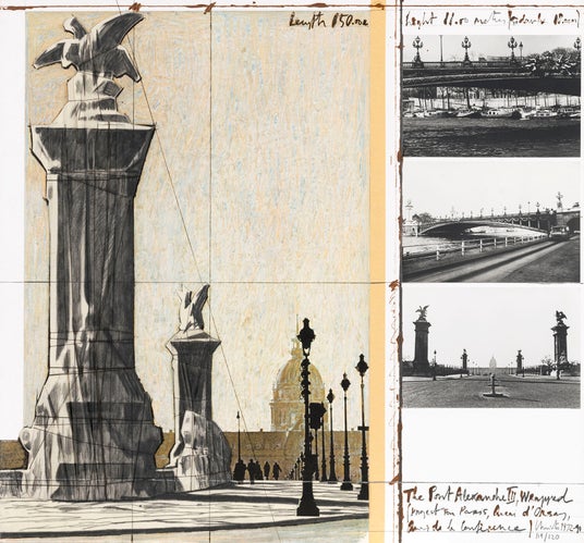 「AFAF Masters」より クリスト《梱包されたアレキサンドル III 世橋、パリのためのプロジェクト、1972-90》1991 年 布、麻ひも、糸、写真、テープ 70×75cm 撮影:野口浩史 提供:Art Front Gallery