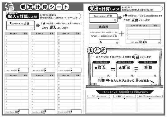 開催前に金融教育専門家監修のレクチャーを実施し、お金や経済について子どもたちに伝えます。また、出店する子どもたちは配布する「収支計算シート」を利用し、売上・経費・利益を自分たちで計算します。