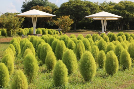 福岡県福岡市に所在する海の中道海浜公園では、虹の花壇、彩りの花壇において2,000株の「グリーンコキア」が見頃になりました。今夏は雨が少なく生育が心配されましたが、猛暑の中今年も元気に成長しました!見頃は9月上旬頃まで、その後少しずつ紅葉し、10月には真っ赤なコキアをご覧いただけます。