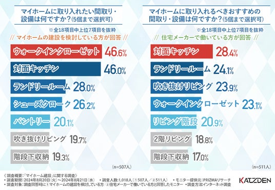 マイホーム建設検討者が取り入れたい間取り・設備TOP3は「ウォークインクローゼット」「対面キッチン」「ランドリールーム」!住宅メーカーが考える取り入れるべき間取りや設備とのギャップとは?
