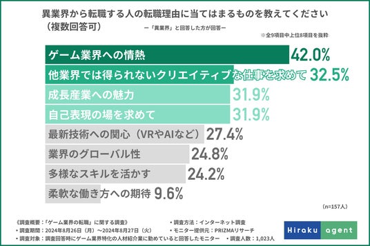 前の質問で「異業界」と回答した方に、「異業界から転職する人の転職理由に当てはまるものを教えてください(複数回答可)」と質問したところ、『ゲーム業界への情熱(42.0%)』と回答した方が最も多く、次いで『他業界では得られないクリエイティブな仕事を求めて(32.5%)』『成長産業への魅力(31.9%)』『自己表現の場を求めて(31.9%)』となりました。