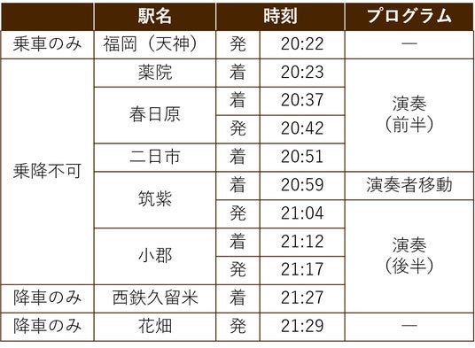 演奏者の交代は西鉄二日市駅~筑紫駅間で行います。
