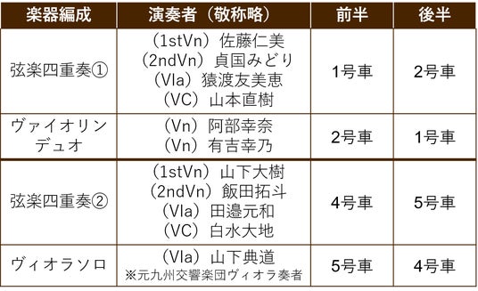 当列車は、西鉄天神大牟田線の開業100周年を記念するとともに、9月28日・29日に5年ぶりにリアル開催される音楽イベント「MUSIC CITY TENJIN 2024」(以下、MCT)のプレイベントとして運行するものです。当日は、公益財団法人九州交響楽団(以下、九州交響楽団)のメンバーとYamaちゃんこと元九州交響楽団ヴィオラ奏者山下典道氏が 4 つの号車に分かれ、弦楽四重奏、ヴァイオリンデュオ、ヴィオラソロの演奏をお楽しみいただきます。西鉄電車でクラシック音楽の生演奏が楽しめる列車の運行は今回が初めてとなります。