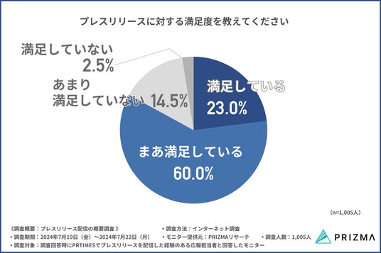 「プレスリリースに対する満足度を教えてください」と質問したところ、8割以上の方が『満足している(23.0%)』『まあ満足している(60.0%)』と回答しました。