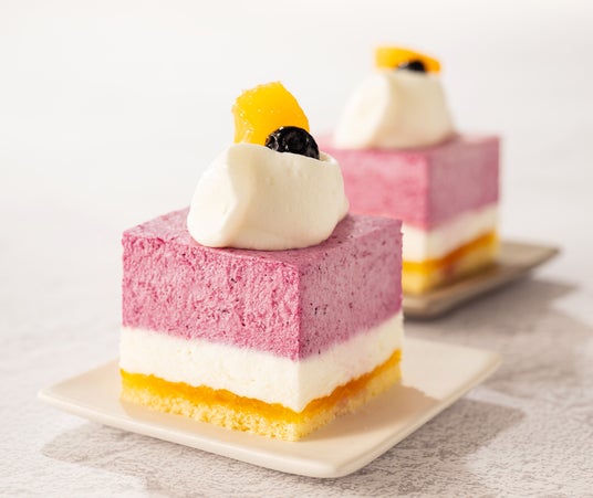 ロイヤルホストのパフェ「ヨーグルトジャーマニー」をイメージしたケーキです。スポンジ生地に、甘酸っぱいカシスクリーム、バニラクリームと⻩桃のソースを重ね、仕上げは爽やかなヨーグルトクリーム とフルーツをプラスしました。付属されているブルーベリーソースをかけてお召し上がりください。