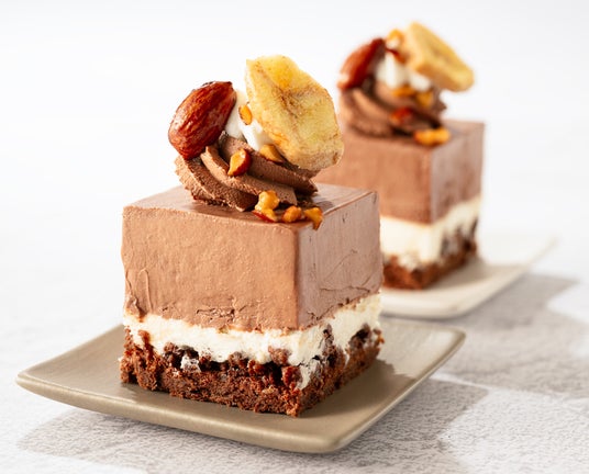 ロイヤルホストのパフェ「ホットファッジサンデー」をイメージしたケーキ です。チョコレートを使用したチョコ生地に、チョコクリームとバナナク リームを重ね、仕上げはチョコクリーム、バナナチップとアーモンドを プラスしました。付属されているチョコレートソースをかけて濃厚な 味わいをお楽しみください。