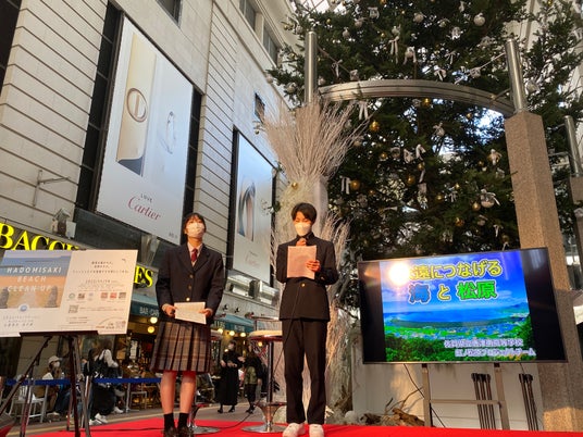 博多大丸エルガーラで開催されたクリスマスツリー点灯式では、対馬の海洋プラスチック問題に焦点を当てたワークショップを実施し、唐津南高校虹ノ松原プロジェクトチームがプレゼンテーションを行いました。