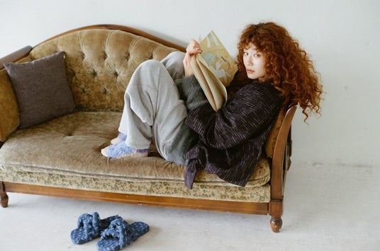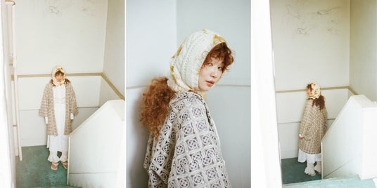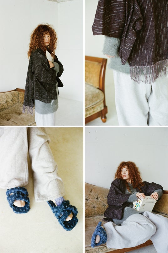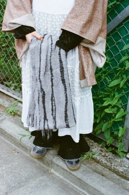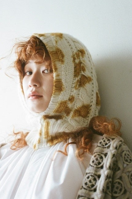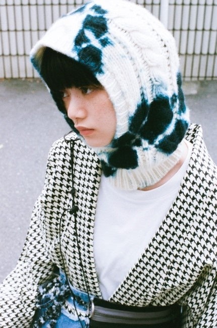 有松鳴海絞りをルーツに待ち、ドイツを拠点に日本の技術を世界へ届けるブランド<suzusan>に製作いただいたショールとセレクトしたバラクラバが登場します。