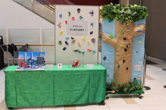 かざとくんの折り紙作品展示(左から ・オリロボ対決 ・エンシェントドラゴン ・昆虫の木)