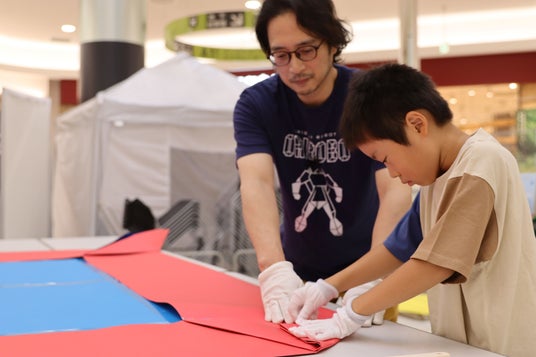 折り紙ロボット「オリロボ」の生みの親フチモトムネジ氏と一緒に、かざとくんが自分の等身大のオリロボを280cm×280cmの折り紙で制作