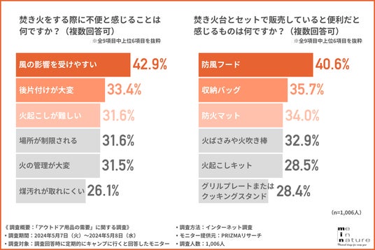 風の影響を受けやすいという回答が最多となり、後片付けの大変さや火起こしの難しさも上位にあがっています。