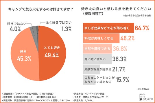 今回の調査で、定期的にキャンプに行く方の9割以上が焚き火をするのが好きで、ゆらぎ効果などで心が落ち着くというヒーリング効果を感じられることが主な理由であることが明らかになりました。