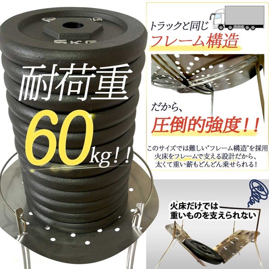 トラックと同じフレーム構造で耐荷重は60kg。太い薪を入れてもびくともしません。