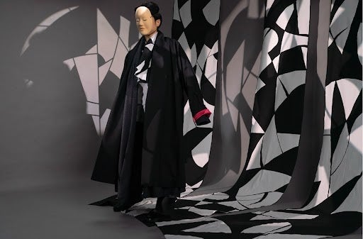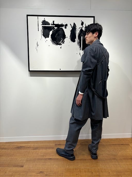 自然崇拝を起源とする日本人の根底にある、水や雲のように流れ行く形、歪、侘や寂びの美意識を、和服とは異なる解釈でとらえ、かつ洋服のように身体を支える機能性を備えています。