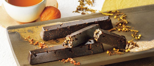京都産のほうじ茶パウダーを入れたミルクチョコレートに、玄米フレーク、京都で製造されたぶぶあられ、フリーズドライの梅干しを詰めたバーチョコレート。香ばしさと深みのあるほうじ茶の風味と、玄米フレーク・ぶぶあられのさくさくとした食感、アクセントに効かせた梅の味わいのバランスをお楽しみください。