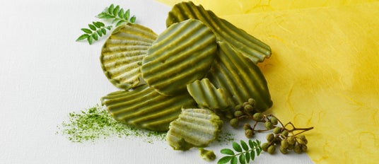 抹茶と和歌山県産ぶどう山椒をまぶしたポテトチップの⽚面に、宇治抹茶のチョコレートをコーティング。口に入れた瞬間にピリッとさわやかに広がる山椒と、ポテトチップの塩味、抹茶チョコレートのほろ苦いコクと⽢さがクセになる味わいです。隠し味にピスタチオペーストも使用しています。