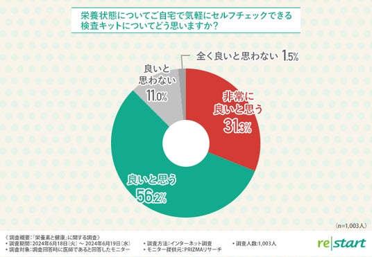 「栄養状態についてご自宅で気軽にセルフチェックできる検査キットについてどう思いますか?」と質問したところ、8割以上の方が『非常に良いと思う(31.3%)』『良いと思う(56.2%)』と回答しました。