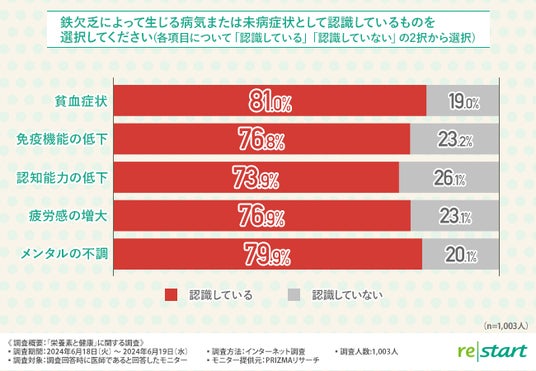 「鉄欠乏によって生じる病気または未病症状として認識しているものを選択してください(各項目について「認識している」「認識していない」の2択から選択)」と質問したところ、認識していると回答した割合いについては以下のような回答結果になりました。