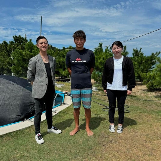 藤原サーモンの養殖場にて 左)ルエラブル・シェフ木原 中央)ラナコーポレーション(株)藤原氏 右)ルエラブル三苫