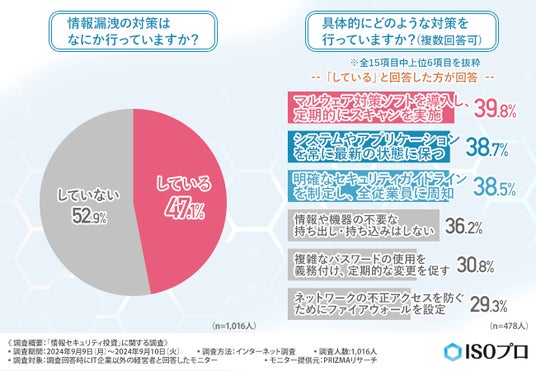 情報漏洩対策を行っていると回答したのは半数以下で、過半数が対策を実施していないことが示されました。