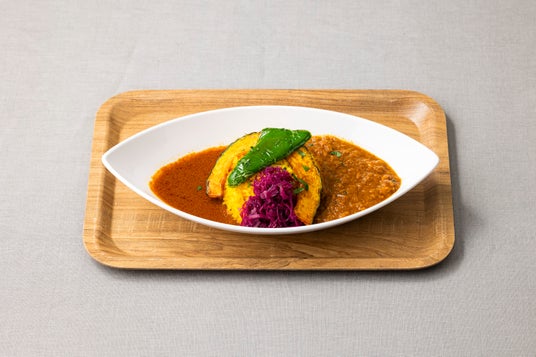 カレー/750円~(写真は合い掛けカレー)スパイスの香りと味わいを感じる一皿。大きな野菜のトッピングも魅力。