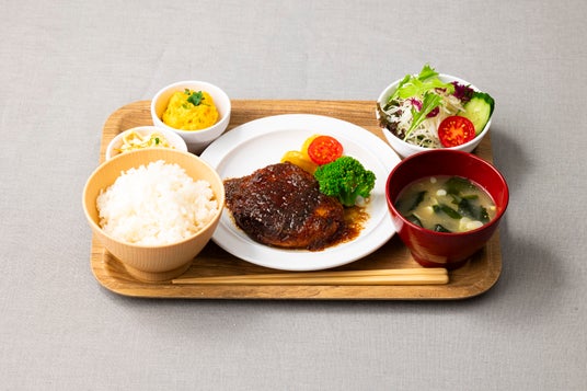 定食/900円(写真はハンバーグジャポネソース)小鉢2種とサラダ、だしの風味豊かな味噌汁付き。