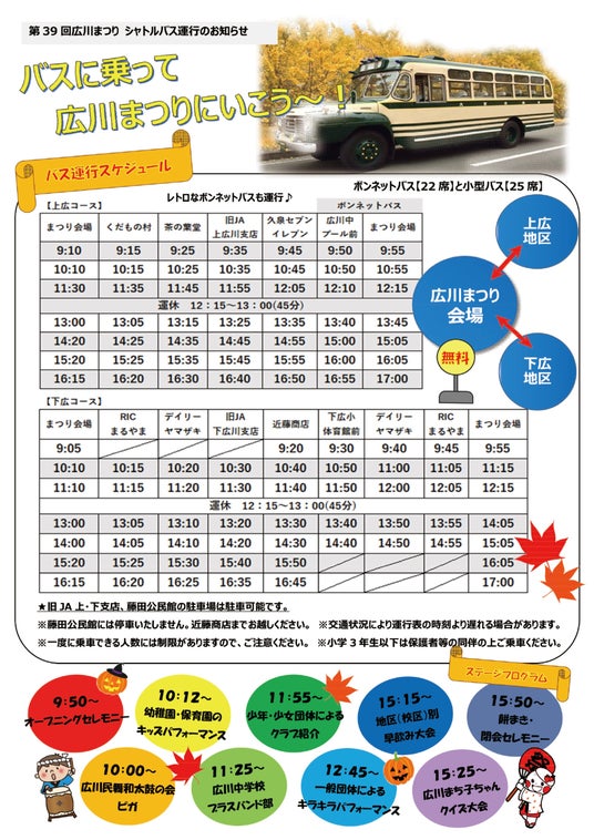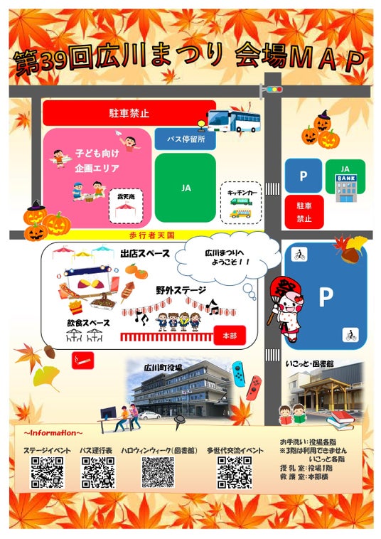 毎年10月に開催している広川まつり。5年ぶりで39回目をむかえます。会場では、地元保育園や小中学生のダンスパフォーマンス、トランポリンやAスライド等の移動遊具で遊ぶことのできる「ヒロチル」、ヤマメのつかみ取り体験といった子ども向けのイベントも実施します。地元物産展やキッチンカーもありますので、お食事をしながらのご参加も可能です。是非、ご家族、ご友人と一緒にご来場ください。詳しくは以下のまつりホームページをご覧下さい。