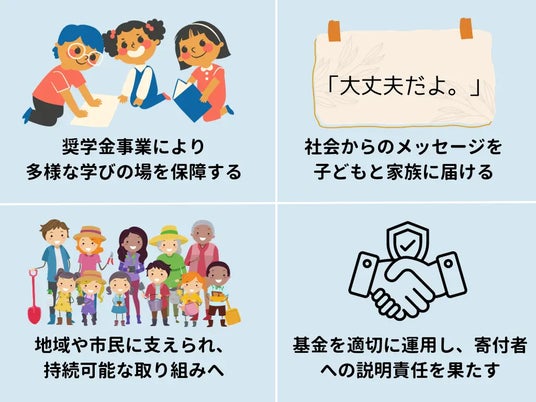 ちくご川コミュニティ財団は、筑後川関係地域(福岡、佐賀、大分、熊本の4県)で不登校の子どもの多様な学びの場を保障することを目指して、2024年2月1日に「子どもの多様な学びの場を保障する基金(愛称:たまきちゃん)」を立ち上げました。不登校のためフリースクール等を利用する子どもを対象とした給付型奨学金事業を運営しています。民間財団が、不登校の子ども支援を目的とした奨学金事業とその基金を立ち上げるのは九州初です(ちくご川コミュニティ財団調べ)。