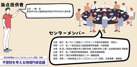 一般財団法人ちくご川コミュニティ財団(所在地:福岡県久留米市梅満町、代表理事:宮原信孝、以下「ちくご川コミュニティ財団」)は、不登校の子どもたちが置かれている状況や課題について市民が集まって考える「不登校を考える地域円卓会議」を、株式会社西日本新聞社(本社:福岡県福岡市中央区、代表取締役社長:田川大介、以下「西日本新聞社」)と共催いたします。