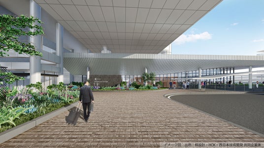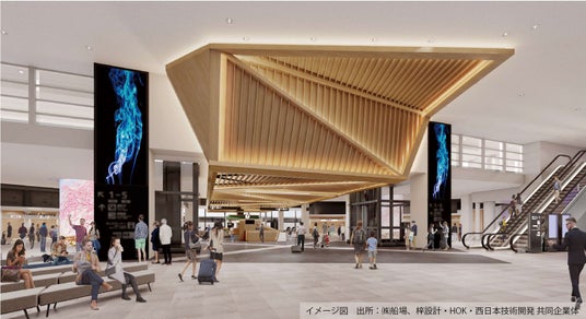 - 到着ロビーを約3倍※2に拡張し、福岡の玄関口としてふさわしい快適な空間でお客さまをお出迎えします。ゆったりと快適に過ごせる待合環境を整備するほか、お客さまが次の目的地にスムーズに移動できる動線を確保します。バスターミナル機能や出到着時に必要なサービスについても充実します。