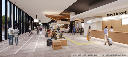 - 新たにバスターミナル機能を整備することで、高速バス・路線バスに乗車するお客さまは、出発までの時間を屋内で過ごせるようになります。乗車口にはホームドアを設置し安全性に配慮するほか、デジタル表示および音声放送を用いてバスの運行情報を多言語でリアルタイムに提供することで外国から来られたお客さまも安心してご利用できます。