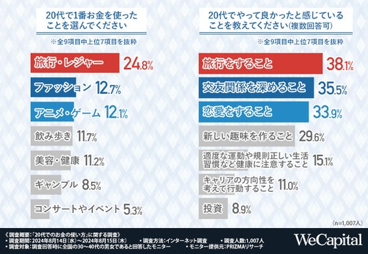 20代は「旅行・レジャー」「ファッション」などに1番お金を使った方が多く、20代にやって良かったこととして「旅行」「交友関係を深める」「恋愛をする」などが上位になりました。