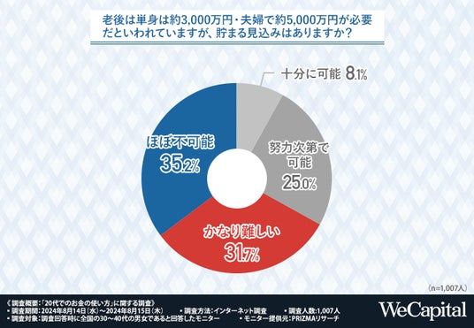 「老後は単身は約3,000万円・夫婦で約5,000万円が必要だといわれていますが、貯まる見込みはありますか?」と質問したところ、『十分に可能(8.1%)』『努力次第で可能(25.0%)』『かなり難しい(31.7%)』『ほぼ不可能(35.2%)』という回答結果になりました。