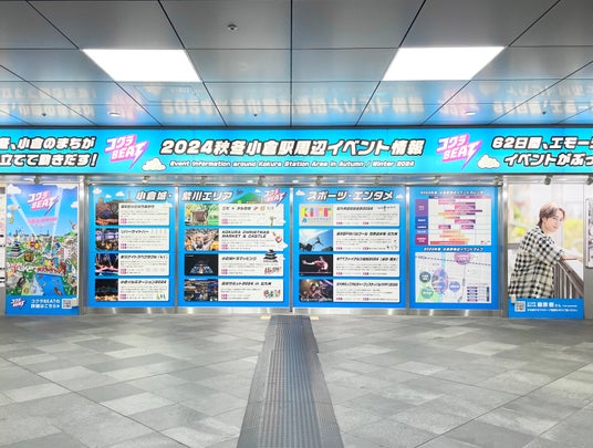 2024年10月25日に始まった小倉市街地を中心に繰り広げられる「コクラBEAT」のプロモーションとして、JR小倉駅が「コクラBEAT」一色になりました。2024年12月25日までの連続62日間の期間中、小倉城や紫川周辺で開催される「小倉イルミネーション2024」をはじめ、「リバーサイドバー」や「クリスマスマーケット」など、期間中のイベントが一目でわかるワクワクするようなデザインになっています。