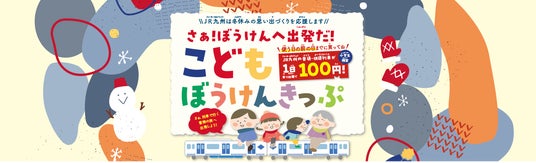 JR九州では、帰省や初詣にもご利用できるお子さまにおトクな「こどもぼうけんきっぷ」を冬休み期 間も発売いたします!お子さま限定で、JR九州の普通・快速列車に 100 円で 1 日間乗り放題となるきっぷ です。さらに、特急券をお買い求めいただければ、JR九州の新幹線や特急列車にもご乗車いただけます!帰 省に使うもよし!初詣に使うもよし!その他にも使い道は無限大!この冬も便利でおトクな「こどもぼうけん きっぷ」を是非ご利用ください!