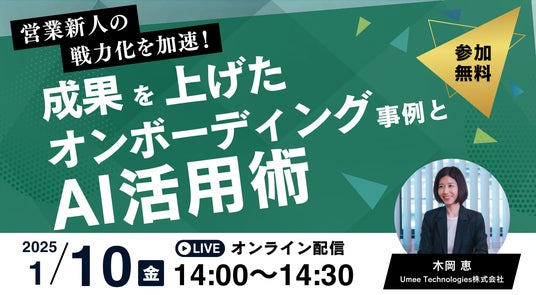 新人からトップセールスを輩出するコネクテッドセールス・プラットフォーム*「Front Agent」を開発・提供するUmee Technologies株式会社(本社:東京都調布市、代表取締役:新納 弘崇、以下「ユミー」)は、2025年1月10日(金)14:00 - 14:30にオンラインセミナー「営業新人の戦力化を加速する!成果を上げたオンボーディング事例とAI活用術」を開催いたします。