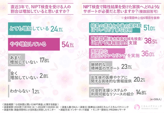 今回の調査で、NIPT検査は近年利用が増加していると感じる小児科医が多く、小児科医も受診を推奨していることから、その需要が拡大していることが明らかになりました。