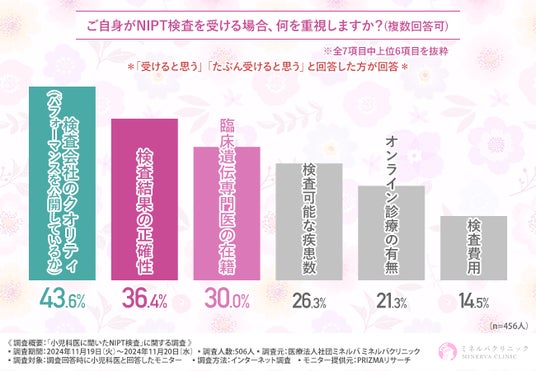 続けて、「ご自身がNIPT検査を受ける場合、何を重視しますか?(複数回答可)」と質問したところ、『検査会社のクオリティ(パフォーマンスを公開しているか)(43.6%)』と回答した方が最も多く、『検査結果の正確性(36.4%)』『臨床遺伝専門医の在籍(30.0%)』と続きました。